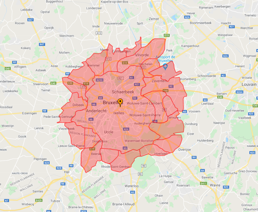 If pickup takes place inside our Brussels Activity Zone (see map hereunder), then :